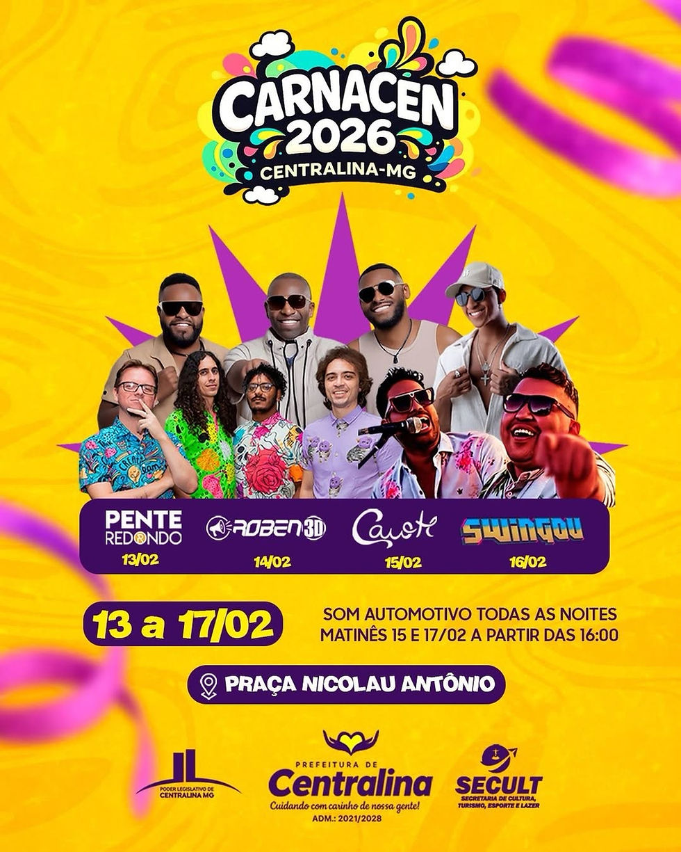 A Prefeitura de Centralina, por meio da Secretaria Municipal de Cultura, Turismo, Esporte e Lazer (SECULT), realiza entre os dias 13 e 17 de fevereiro o Carnacen 2026, um dos eventos mais aguardados do calendário cultural do município. A festa acontecerá na Praça Nicolau Antônio, reunindo música, alegria e tradição, em um ambiente preparado para receber toda a população e visitantes da região.